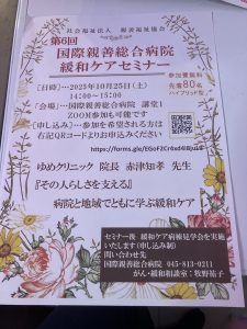 国際親善総合病院での講演会:緩和ケアセミナーの講師 (49話) 公開済み: 2025年10月26日更新: 2025年10月26日作成者: yumeclikカテゴリー: 未分類 この日のテーマは その人らしさを支える 病院と地域でともに学ぶ緩和ケアです。 病院内の講堂、ZOOMにて たくさんの医療関係者の方々に 参加していただきました。 印象深い症例を通じて 大変有意義な議論をすることができました。 みなさま、ありがとうございました。 今後も、安心、安全な街づくりに 貢献していきたいと思います。